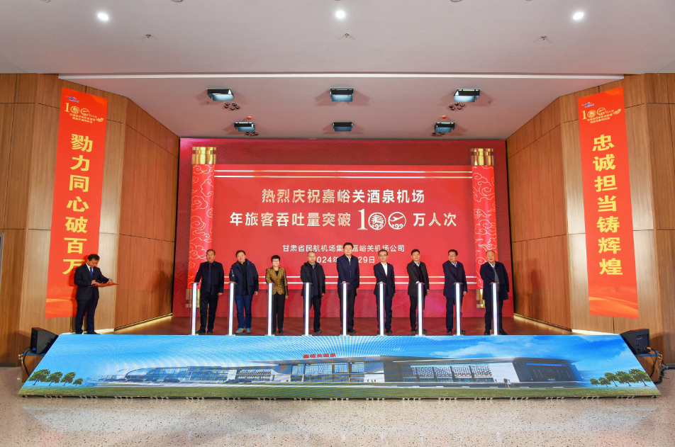 上午11:10,在嘉峪关酒泉机场新建大礼堂“嘉峪关酒泉机场年旅客吞吐量突破100万庆祝活动”正式开始。嘉峪关酒泉机场公司党委书记、总经理何海峰主持庆祝活动并致欢迎词。酒泉、嘉峪关两市相关领导、驻地部队、民航甘肃空管分局、中国航油甘肃分公司、中核四零四、酒钢集团、航空公司及航空公司驻甘机构代表及地方企业、甘肃省民航机场集团、嘉峪关机场改扩建工程参建单位、旅行社等相关单位领导、以及机场退休老同志代表出席活动。甘肃省民航机场集团党委副书记、总经理罗斌向100万幸运旅客赠送礼品。嘉峪关市副市长王晋婷致辞。嘉峪关酒泉机场跨越旅客吞吐量百万大关,每一步都凝聚着我们地企双方的心血与汗水。特别是近年来,嘉峪关和酒泉市、民航机场集团地企携手,共同抢抓新时代推动西部大开发、“一带一路”等国家战略带来的叠加机遇,充分发挥区位空域等优势,全力推进机场事业发展。如今,嘉峪关酒泉机场已开通21条航线,通达18个国内主要城市,在区域航空网络中的竞争力和影响力日益增强,成为河西走廊西端重要的空中门户,为地方经济发展注入了强劲动力。