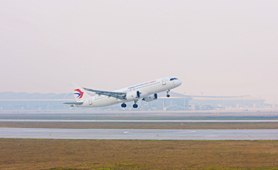 图:东航C919飞机在江北国际机场第四跑道起飞